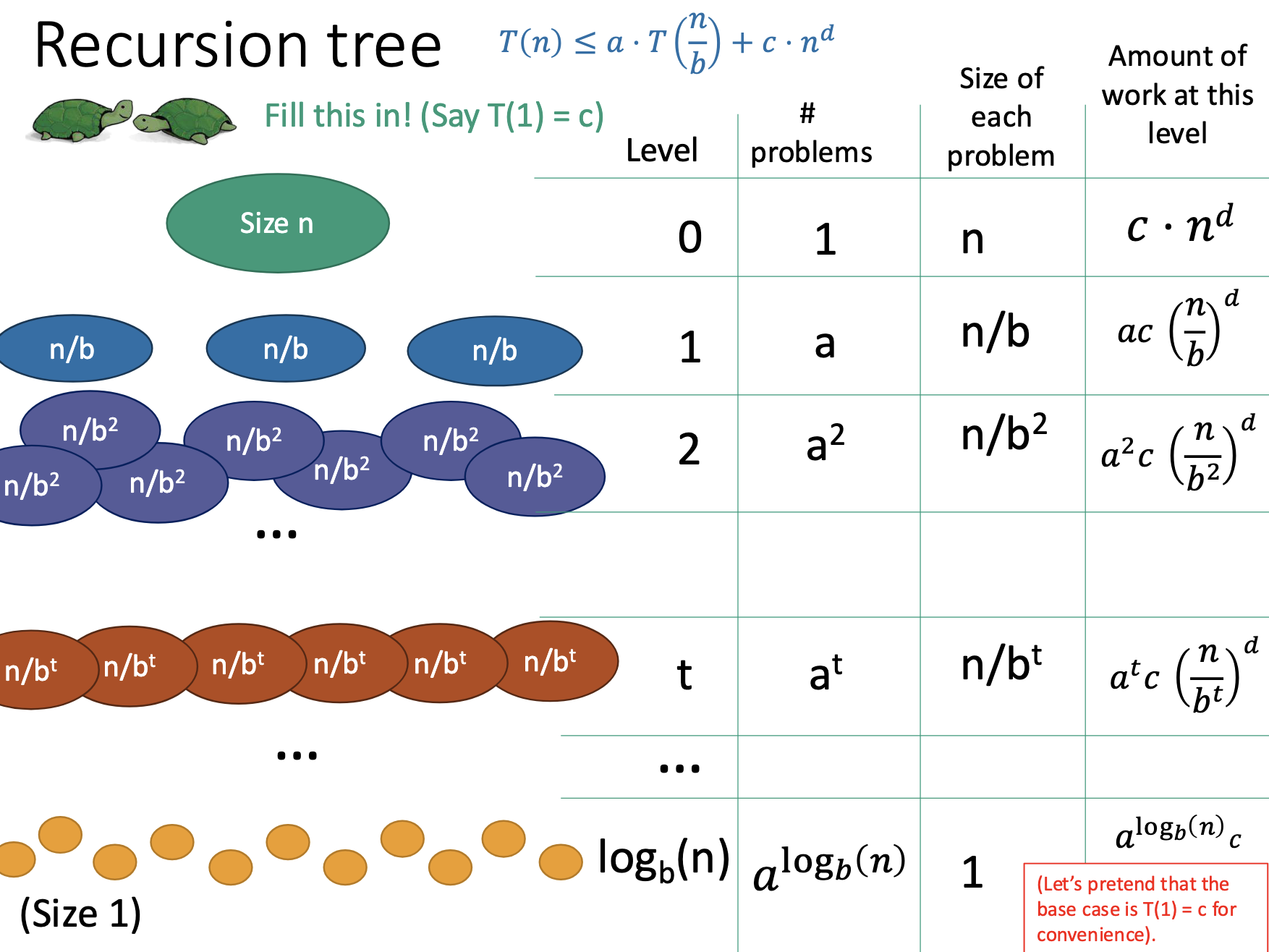 Every Recursion Theorem problem has a struggle between most work sitting at the “bottom” of the tree (number of subproblems explode, \(a > b^{d}\)) vs most work sitting at the “top” of the tree (problem lower in the tree are smaller, \(a < b^{d}\)).