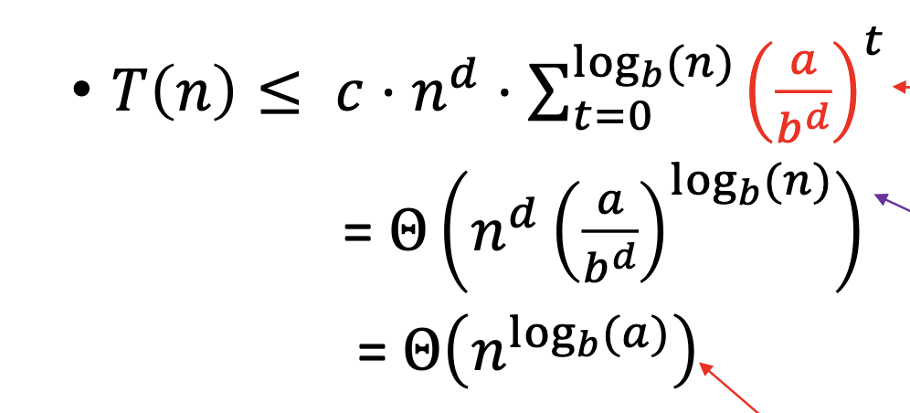 \begin{equation} T\qty(n) = \begin{cases} O\qty(n^{d}\log\qty(n)), \text{ if } a = b^{d}\\ O\qty(n^{d}), \text{ if } a < b^{d}\\ O\qty(n^{\log_{b} \qty(a)}), \text{ if } a > b^{d}\\ \end{cases} \end{equation}