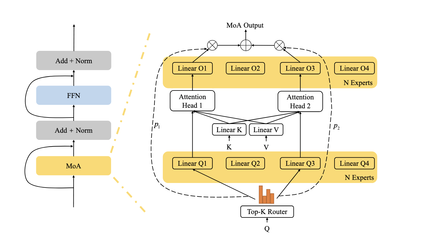 Split \(Q\) projection and attention out projection into experts, with one router coordinating them.Better than MHA performanec.